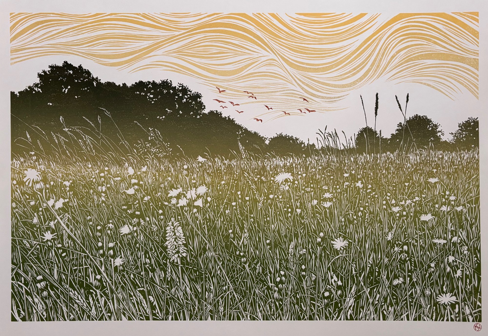 This linocut print shows a view of a wild grassy meadow on the southern edge of the North York Moors National Park. It is a mutli-block linocut print with three blocks used to create the final image.