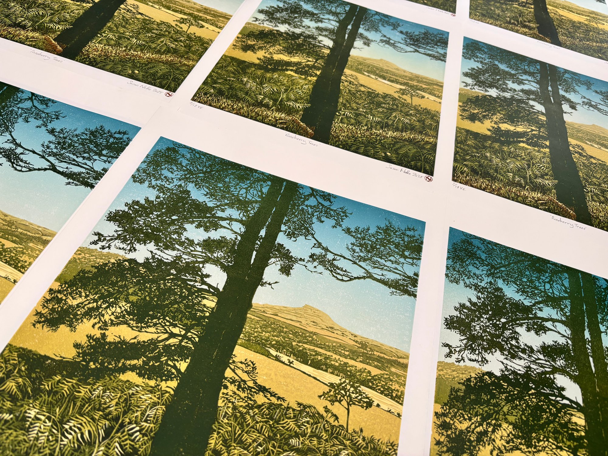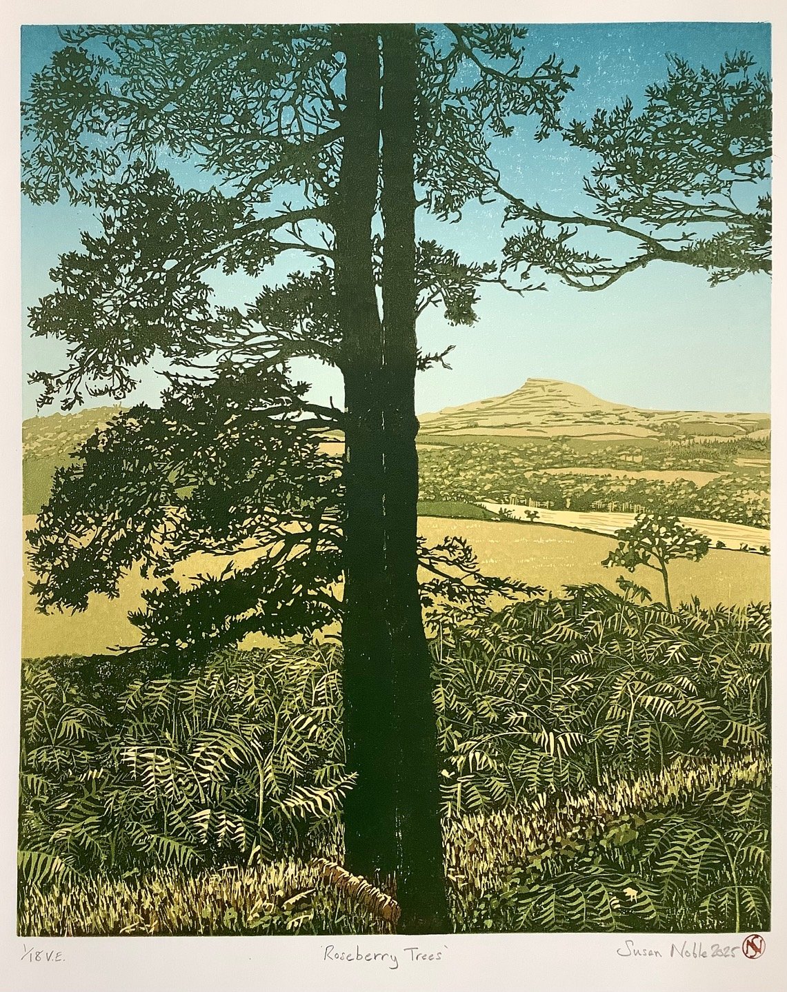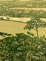 This linocut print shows a view of Roseberry Topping on the northern edge of the North York Moors. Visible for miles around, its crooked conical shape have made it a Teesside landmark which some locals ironically call the ‘Yorkshire Matterhorn’