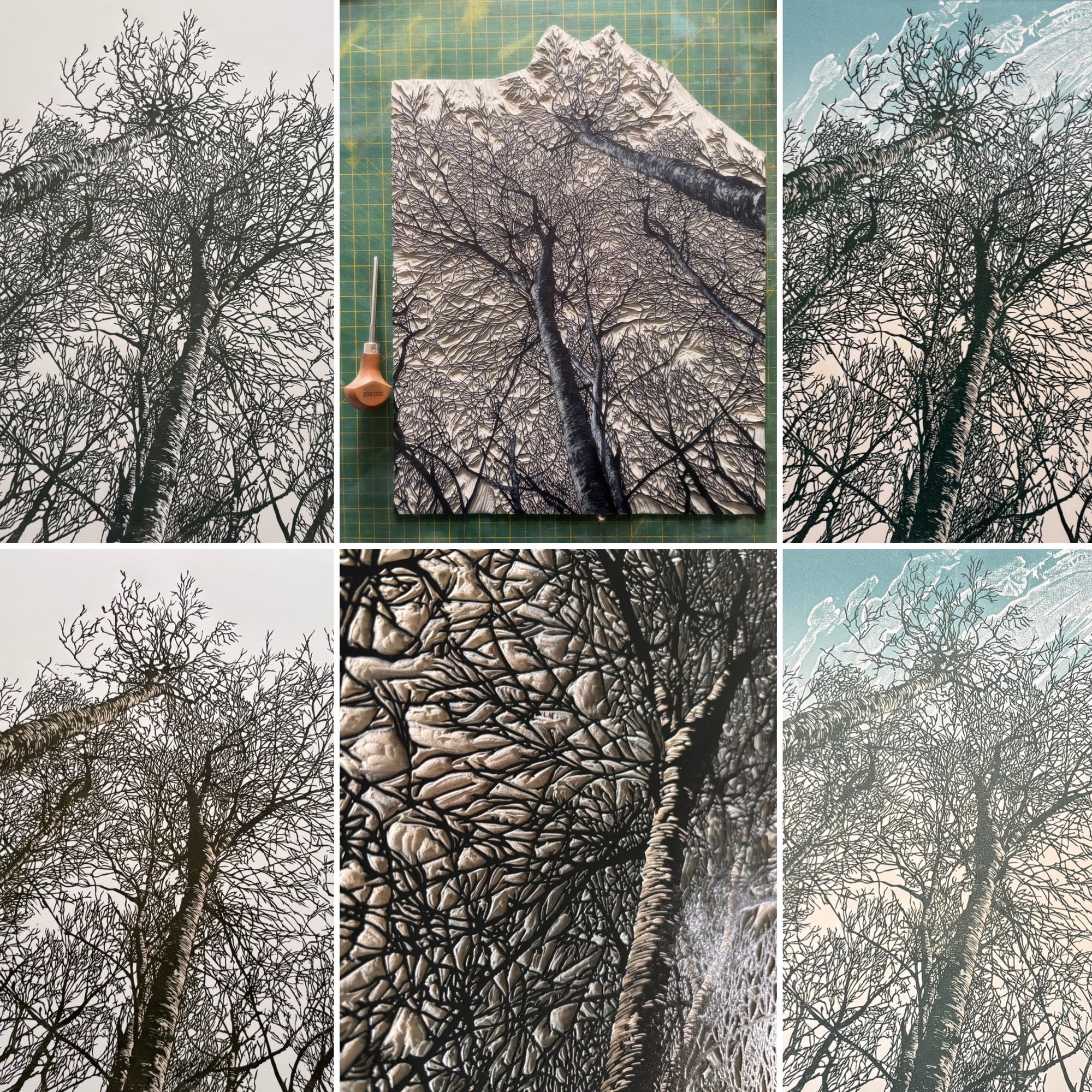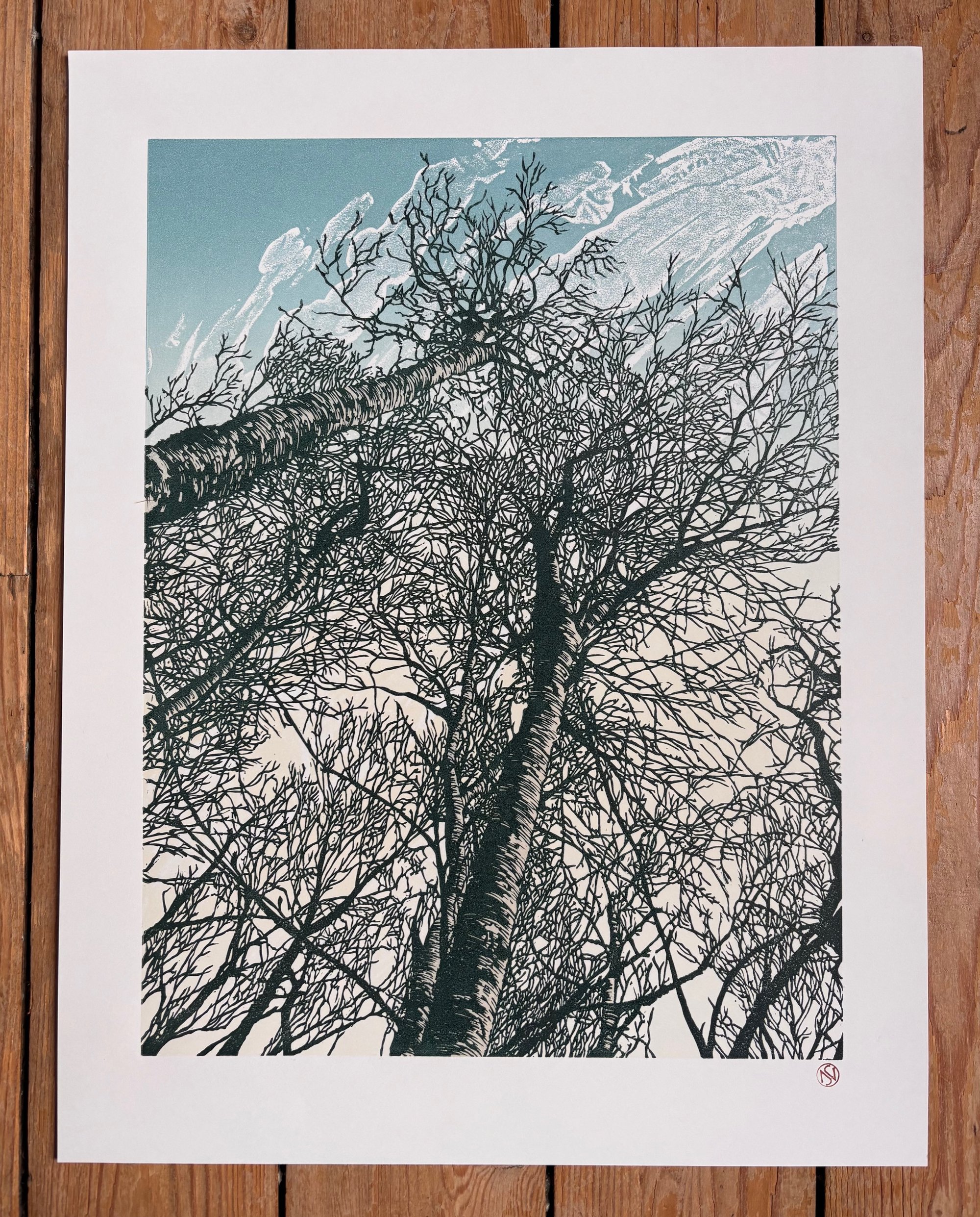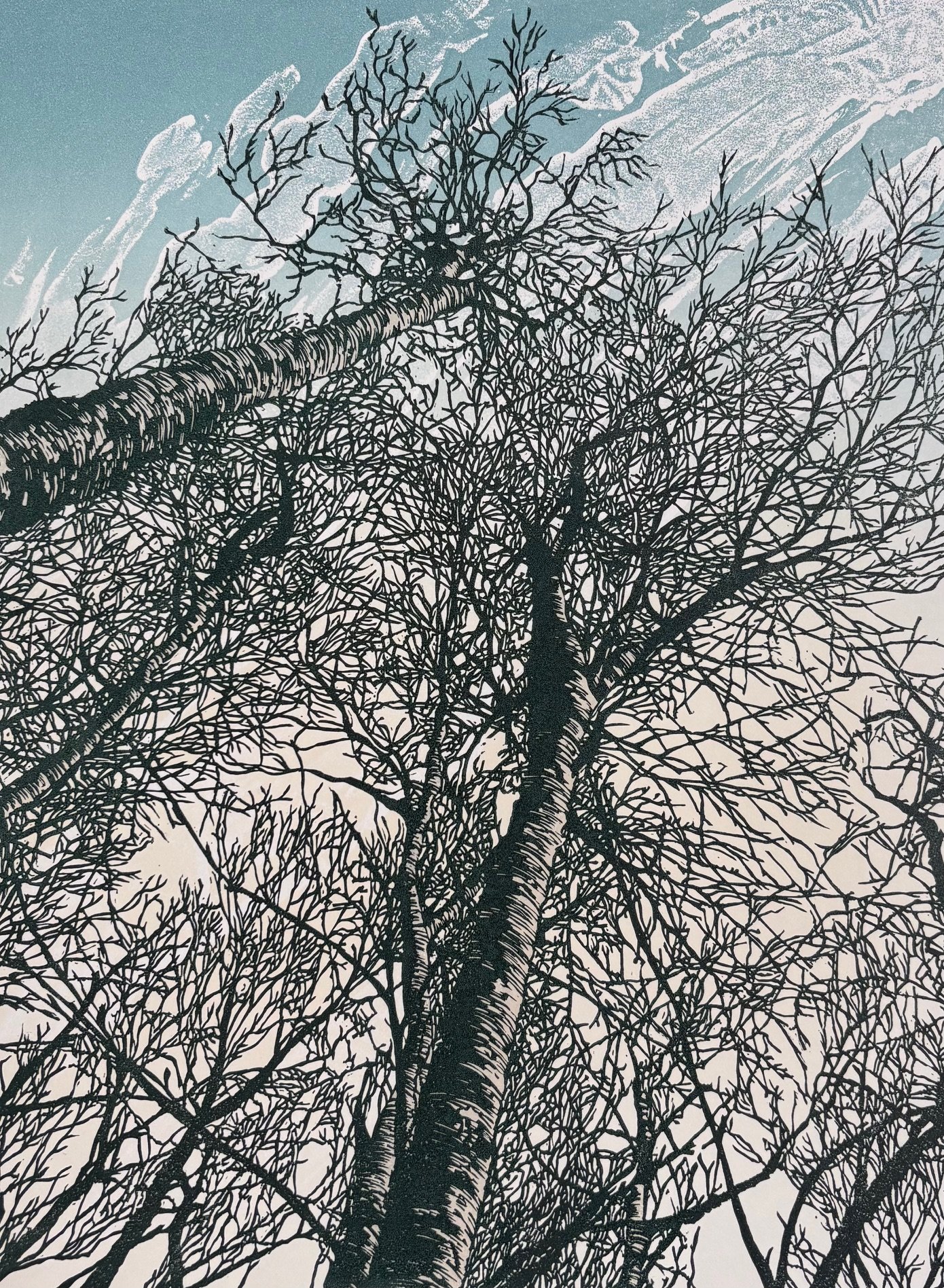 This linocut print shows a view looking upward at the trees on the edge of a North Yorkshire woodland. It is a 3 layer original reduction linocut print, using just one block of lino and a process of carving away the lino between each layer of colour to produce the final image.