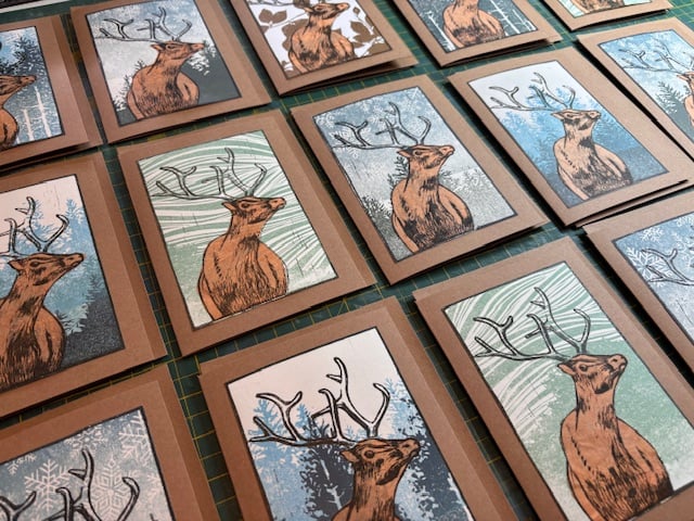 Pack of 5 handmade Xmas cards using off-cuts of rejected prints (various designs and sizes) and Kraft recycled card.